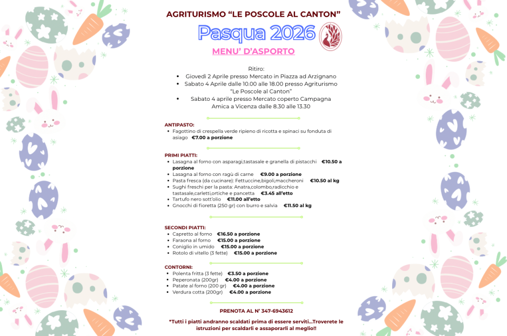 • Massima freschezza: Ritiro al mercato di Vicenza sabato 4 aprile dalle 8.30 alle 13.30 ed in Agriturismo SABATO 4 aprile dalle 10.00 alle 18.00
